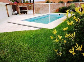 Jardín con parrillero y deck techado, piscina de material de 10 x 3 y gran playroom.